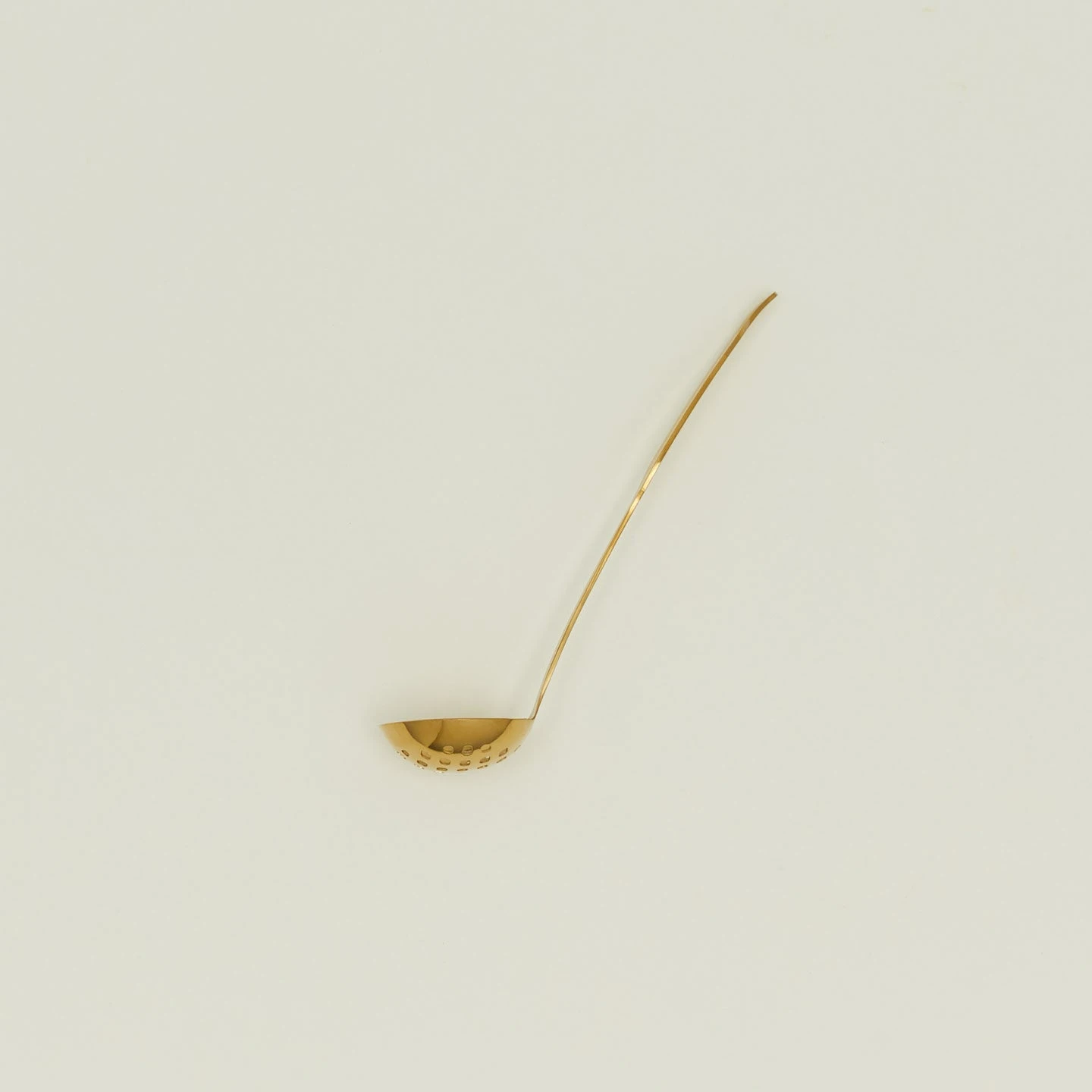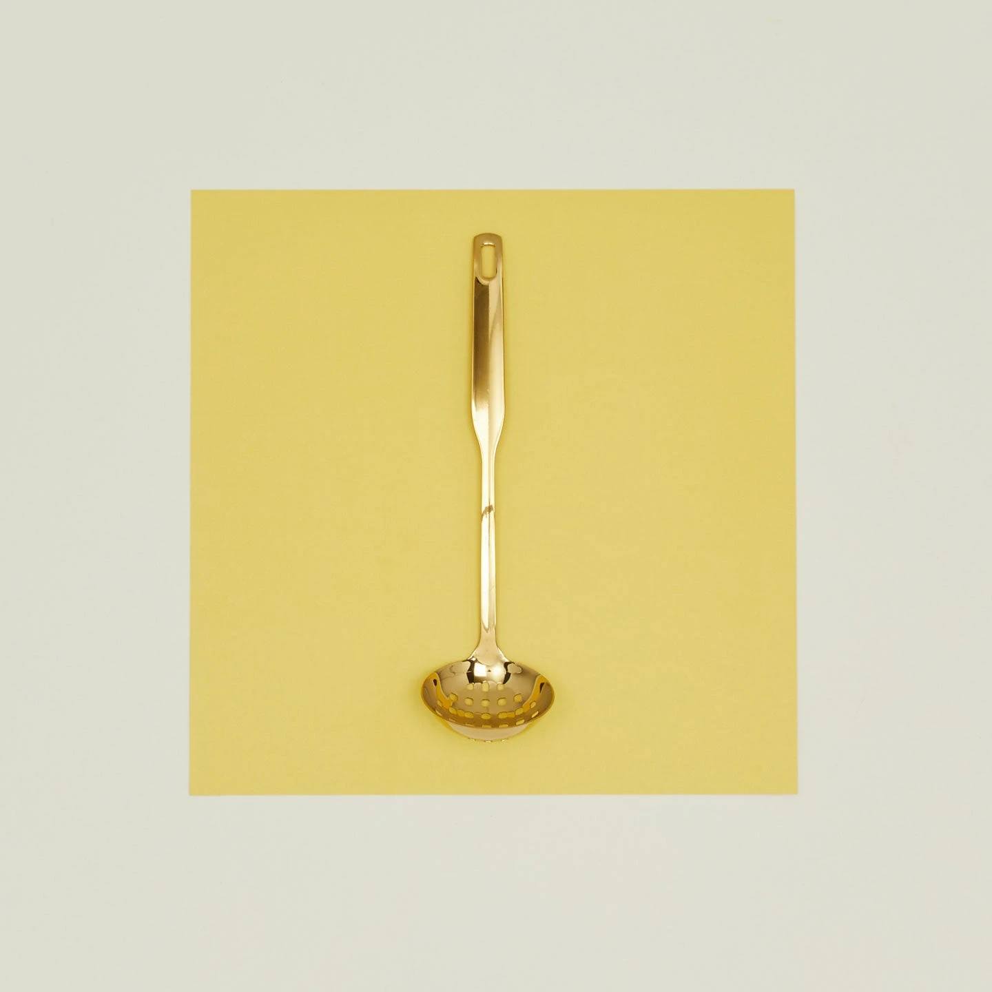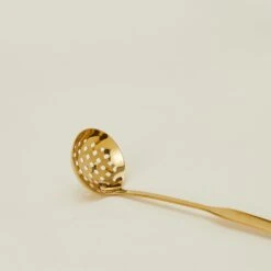 - Stainless steel slotted ladle with a gold finish