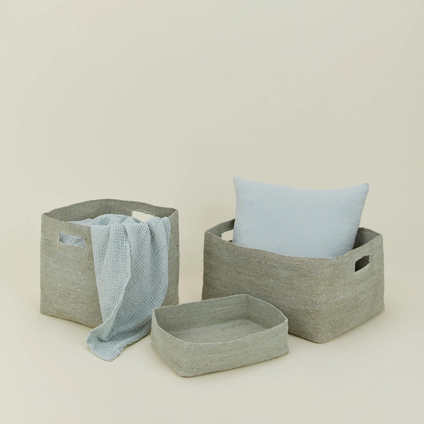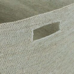 - A handwoven seagrass basket with handles for easy transport