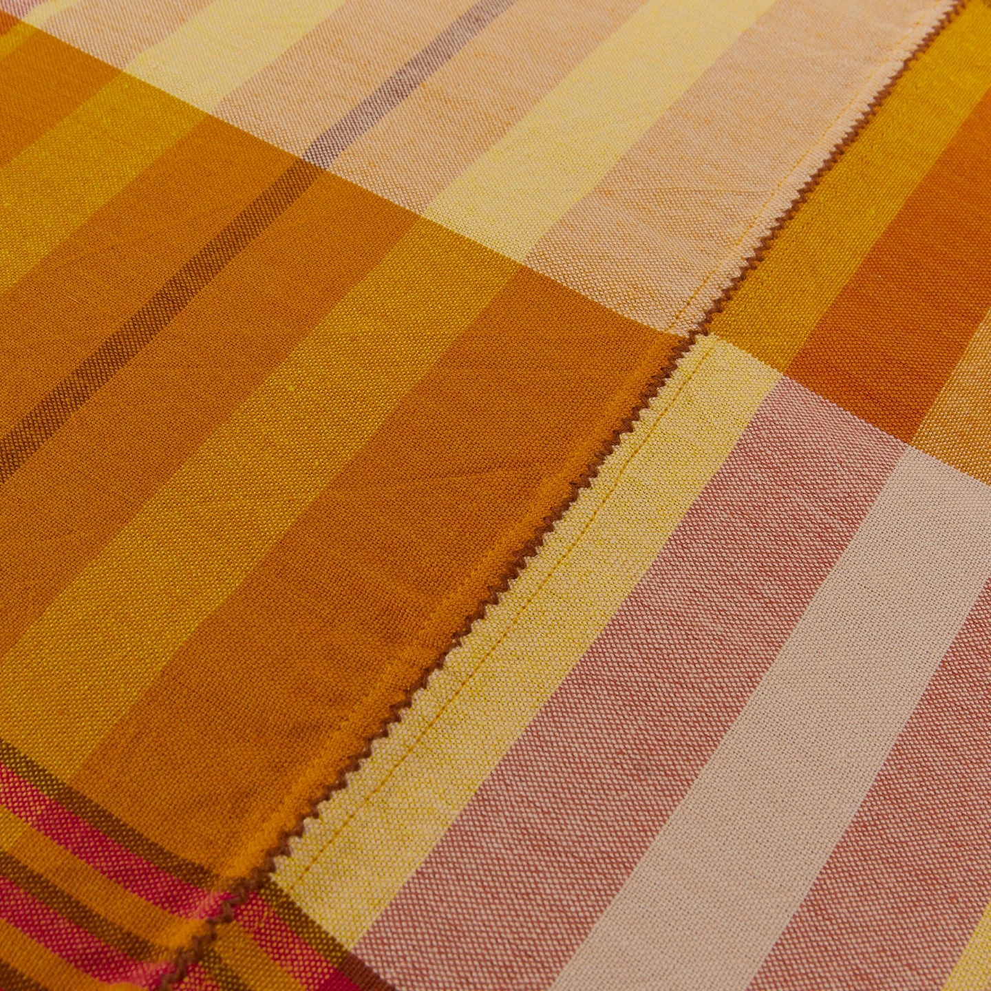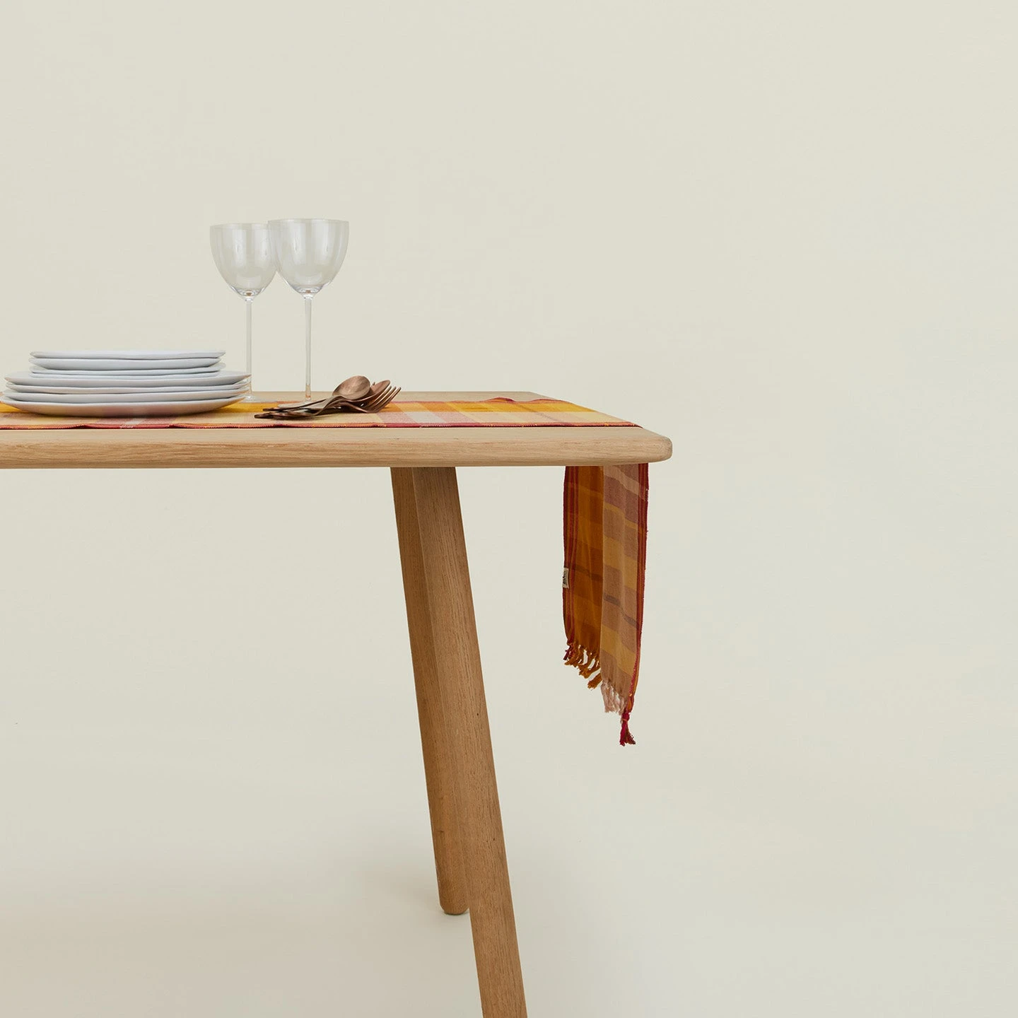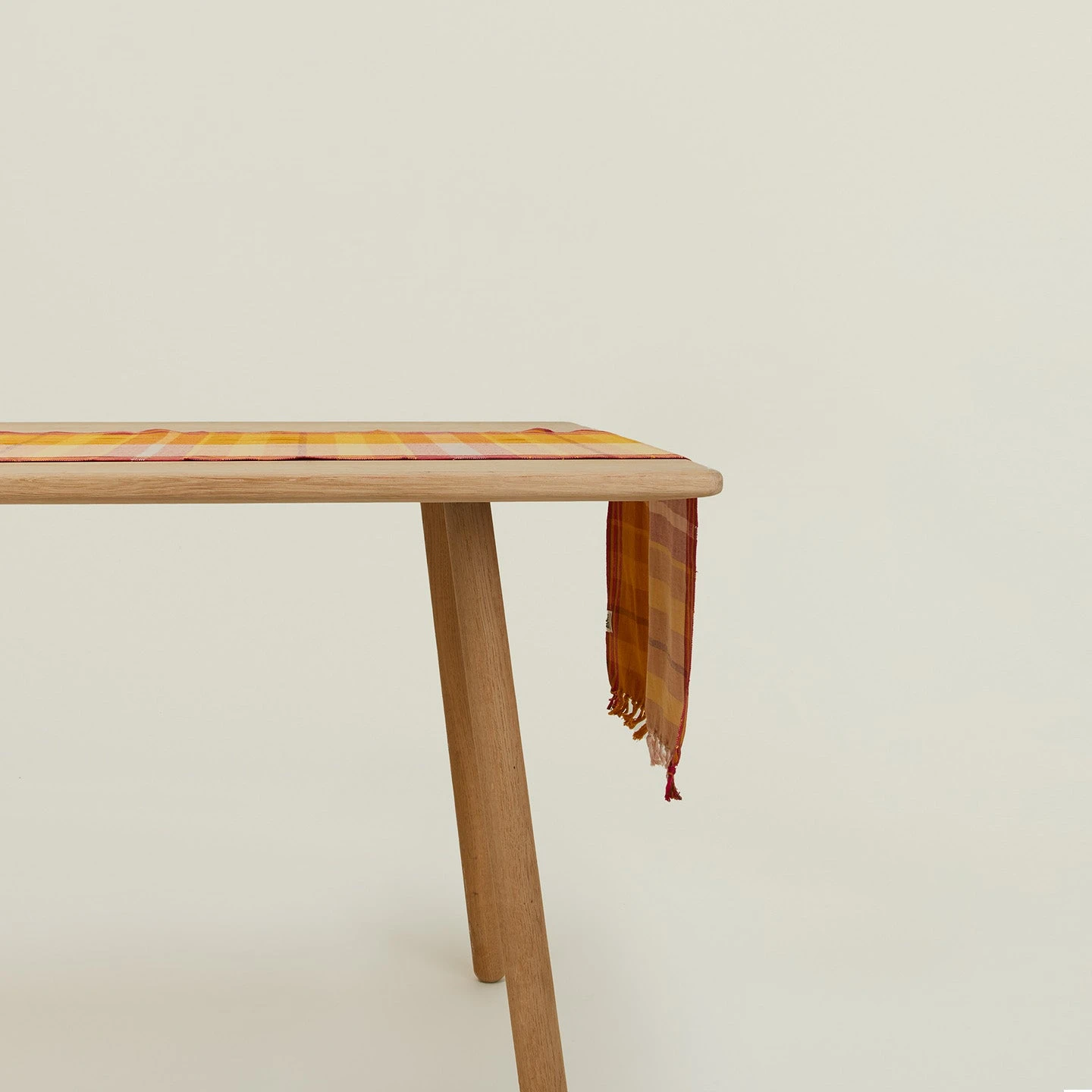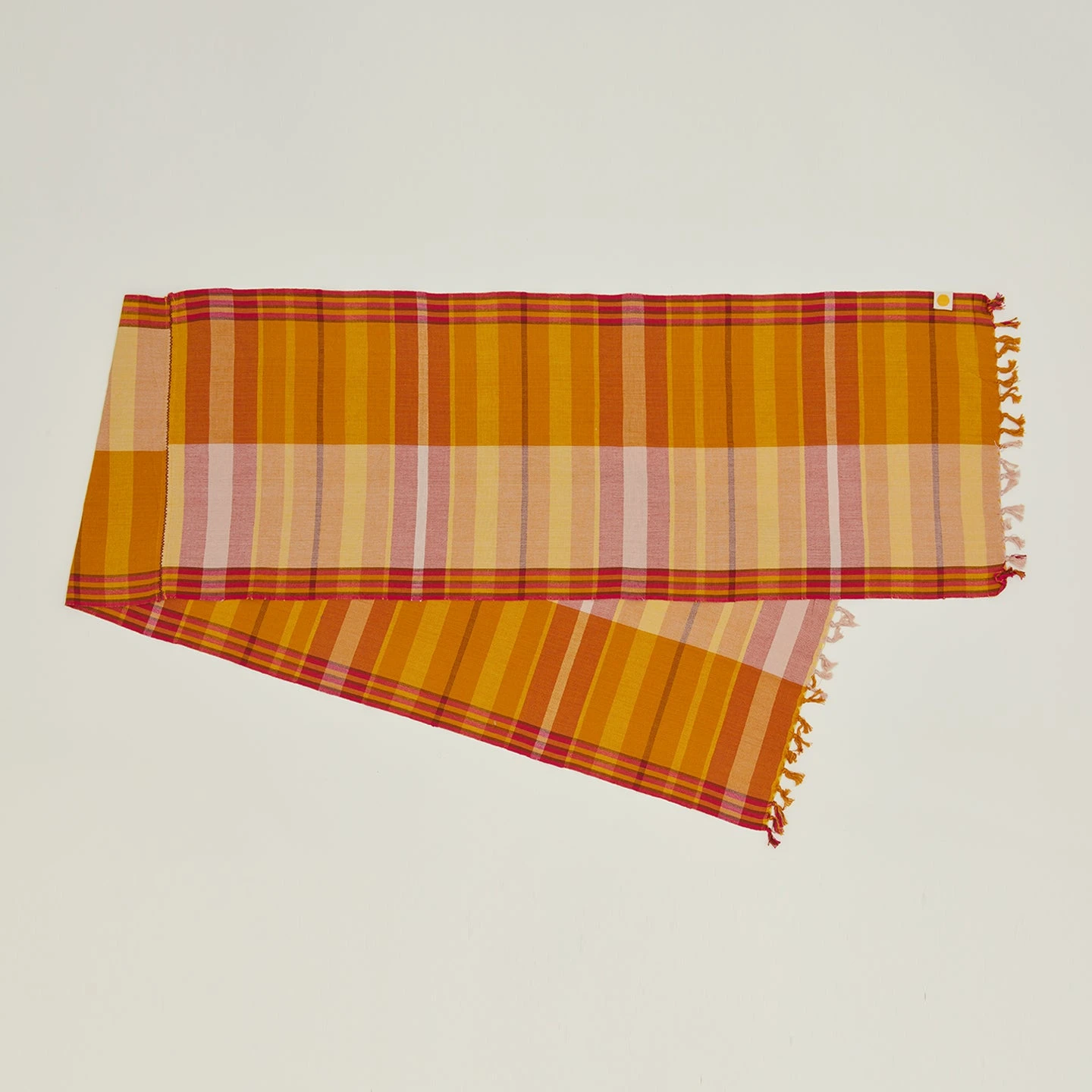 - Hand woven plaid runner with ochres, pink, + cream, plus a blue zigzag down the middle