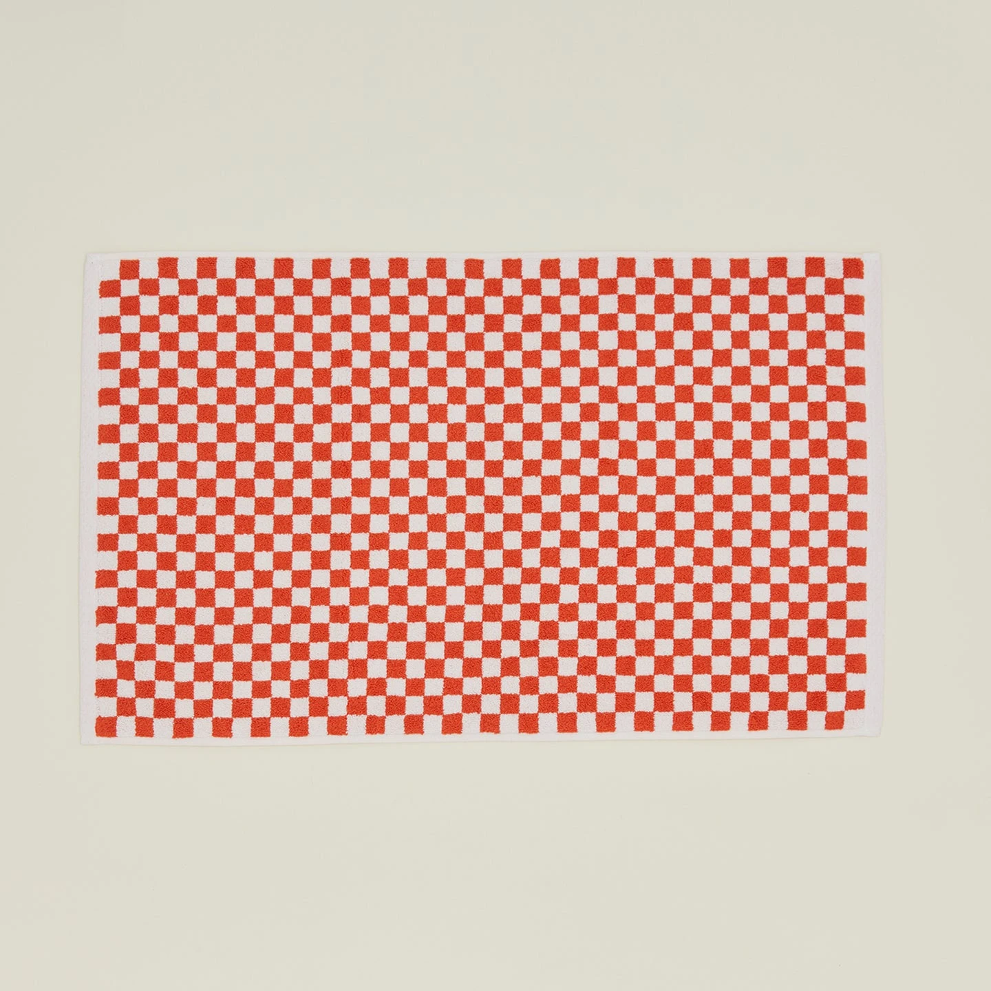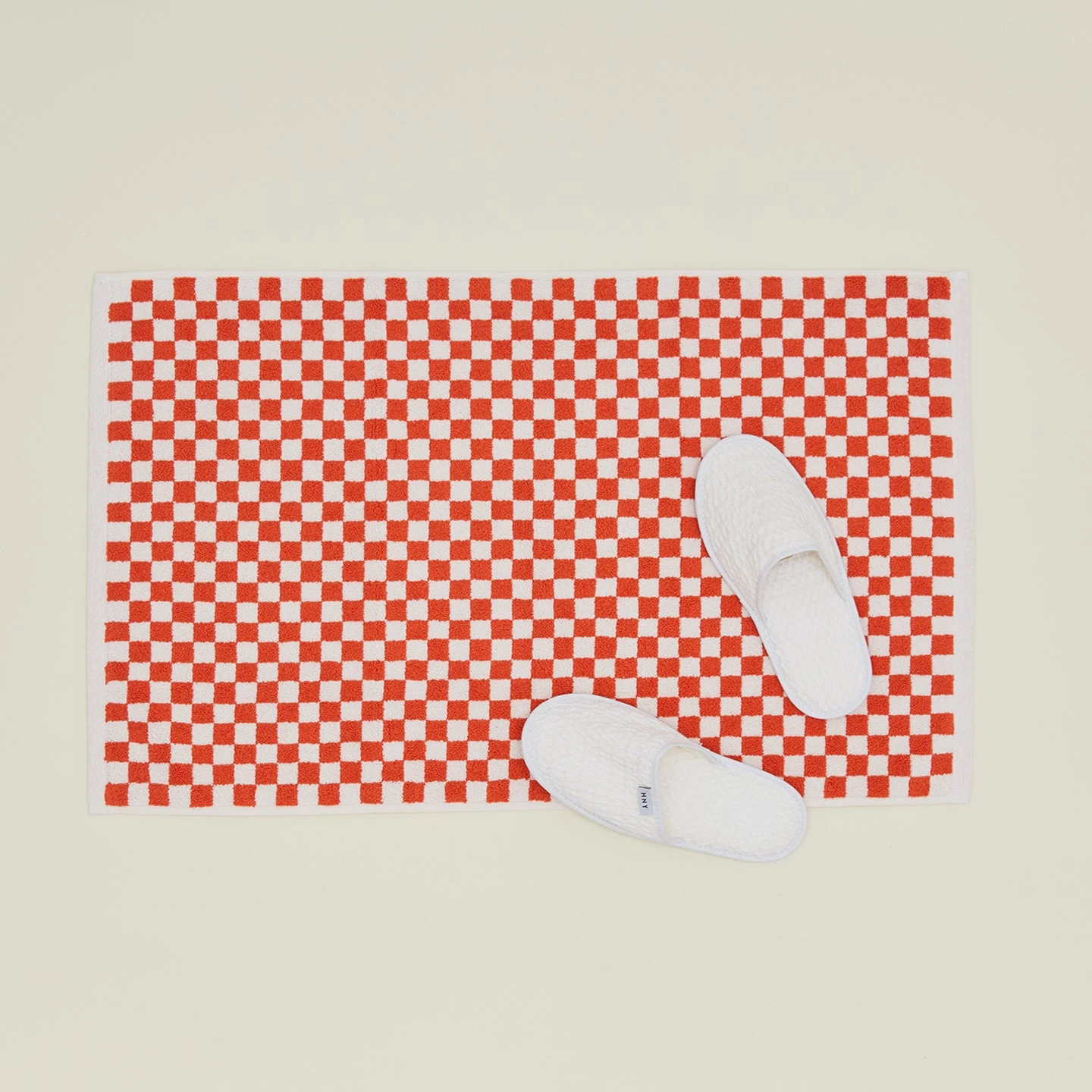 - 100% Organic Cotton bath mat in Paloma Red + Ivory checkerboard