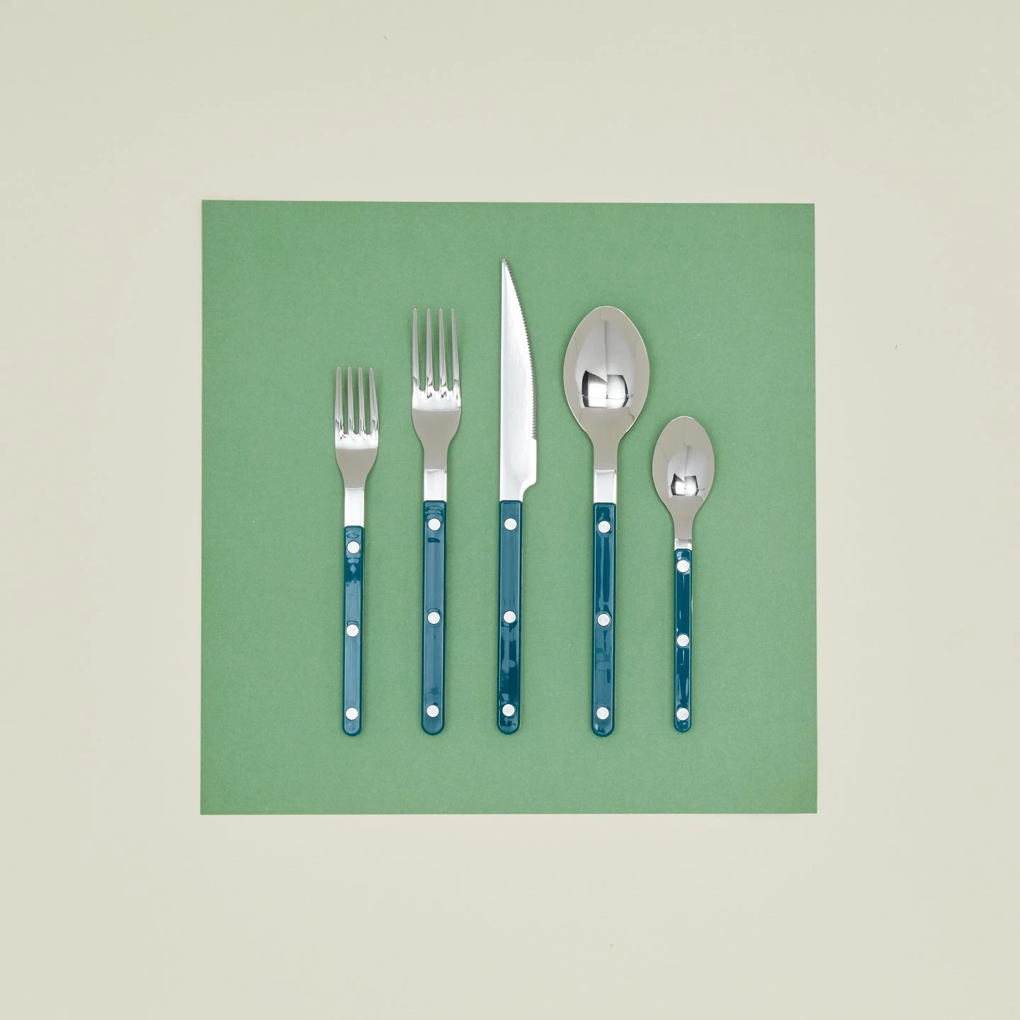- 5-piece set includes dinner knife, salad + dinner forks, and dinner + dessert spoons